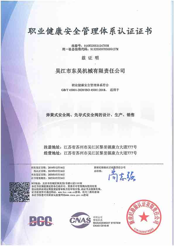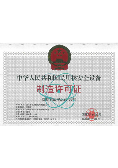 東吳機械是全國第一批擁有機電部安全閥生產許可證的單位,公司于2002年05月取得《中華人民共和國特種設備制造許可證》。然后于2004年9月獲得國家核安全局頒發的《中華人民共和國民用核安全設備設計許可證》和《中華人民共和國民用核安全設備制造許可證》。1998年公司在通過ISO9001質量體系認證的基礎上,相繼取得了ISO14001環境管理體系證書、ISO18001職業健康安全管理體系證書。2018年10月,公司又通過測量管理體系認證并取得測量管理體系認證證書。